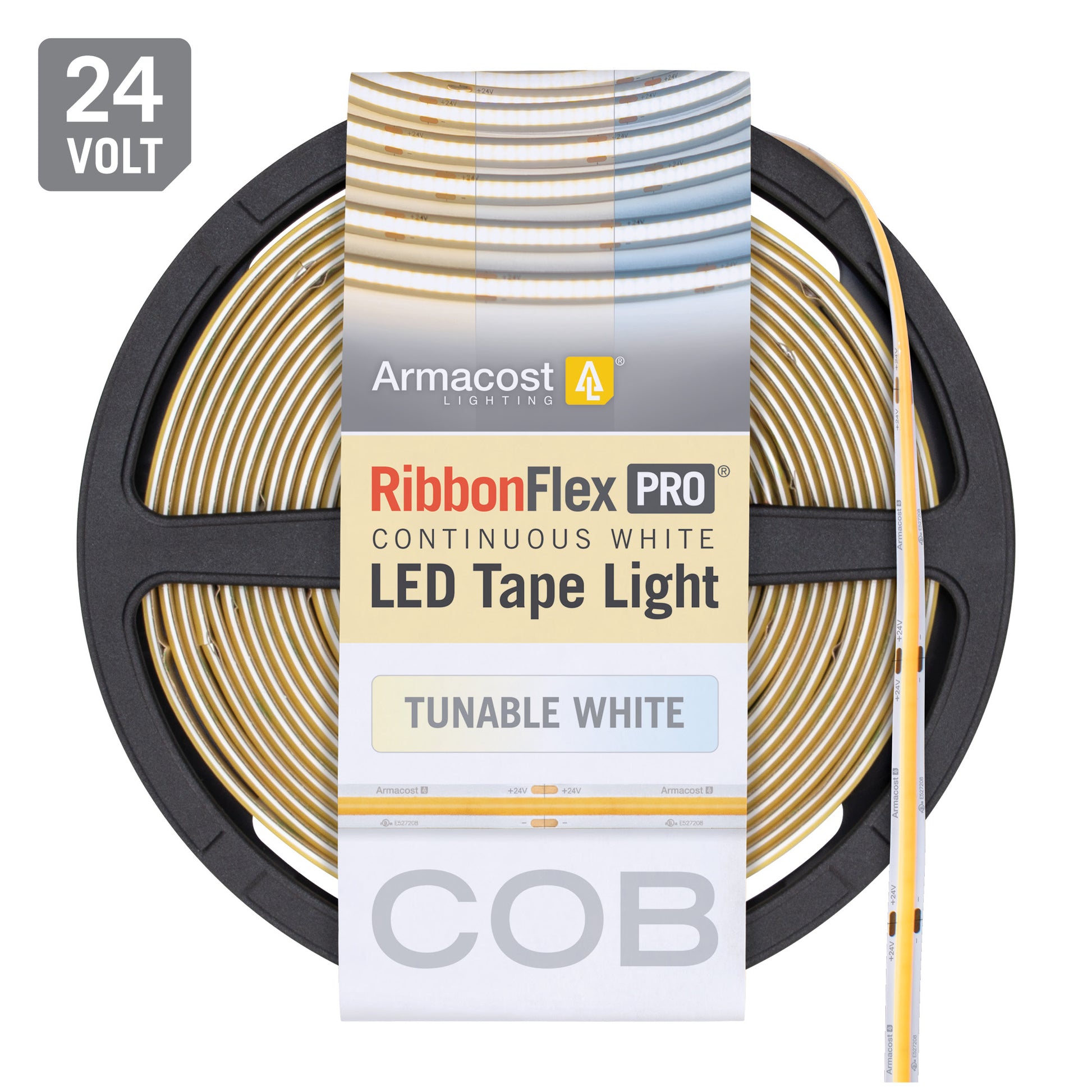 Armacost Lighting's RibbonFlex Pro 24 Volt Tunable White Continuous LED Strip Light features both COB LED and CCT technology, making it the most adjustable and customizable accent lighting solution available. Dotless COB LED strip lights emit a continuous strip of illumination that is free of spots or breaks. CCT tunable technology provides shades of white light from a warm 2700K to a cool 5000K. With a seamless light output, this unique LED light tape is especially perfect for under cabinet lighting as it prevents visible LED dot reflections on countertops. Flexible LED strip light can be used as-is or cut to size for custom installations.  24V power supply and Armacost Lighting ProLine Tunable White LED Controller required and sold separately.