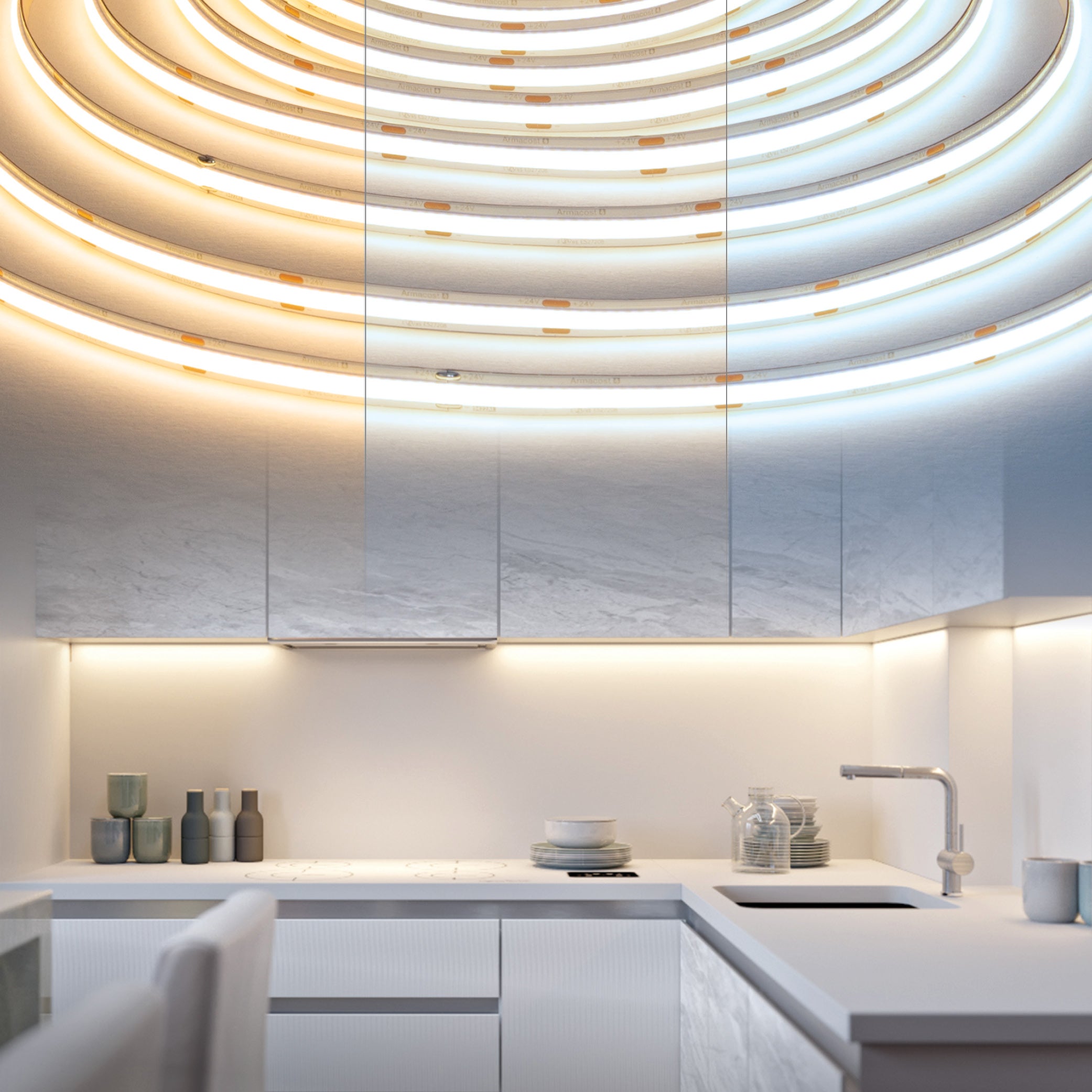 • Continuous COB white tape light featuring a high CRI (90) and tunable color temperature control