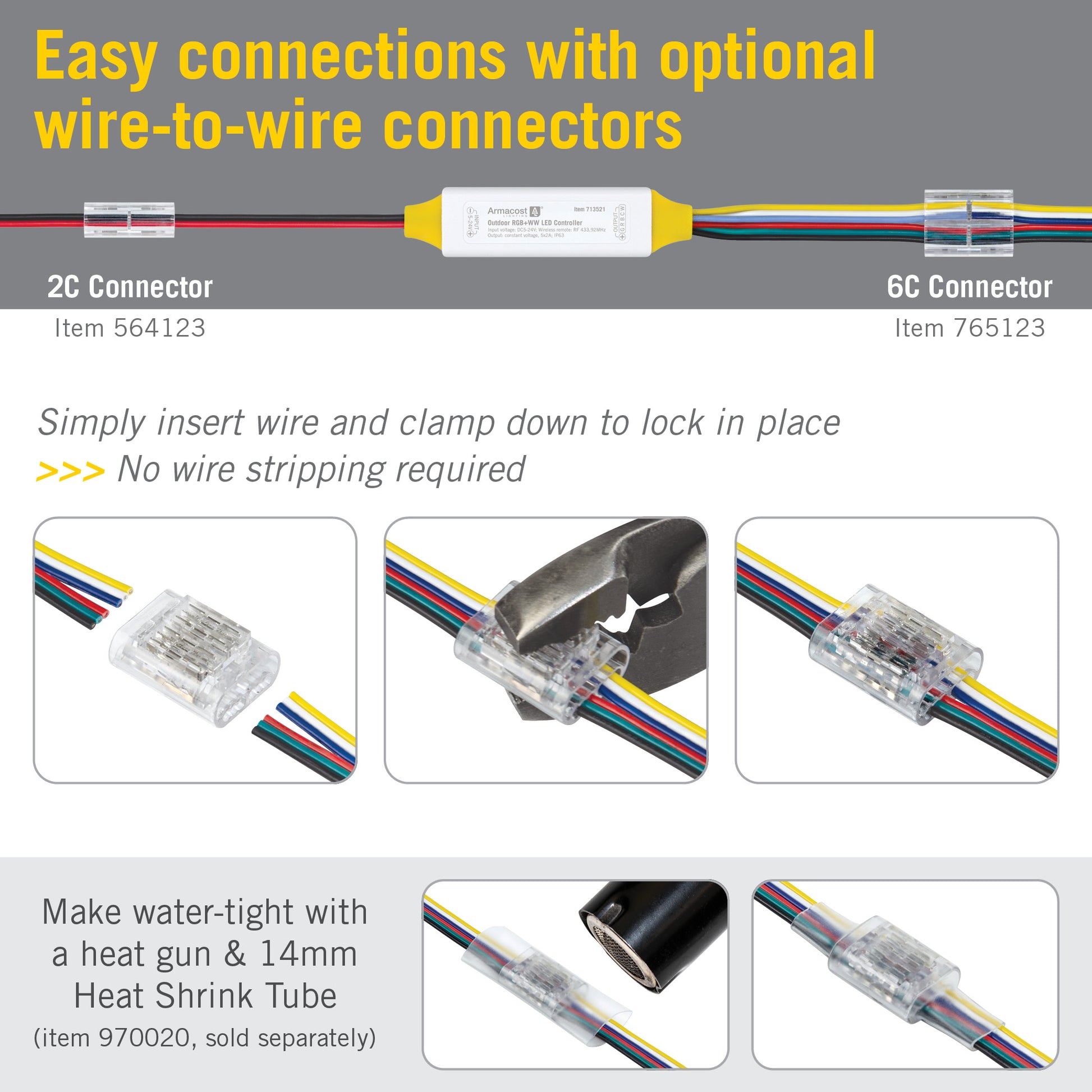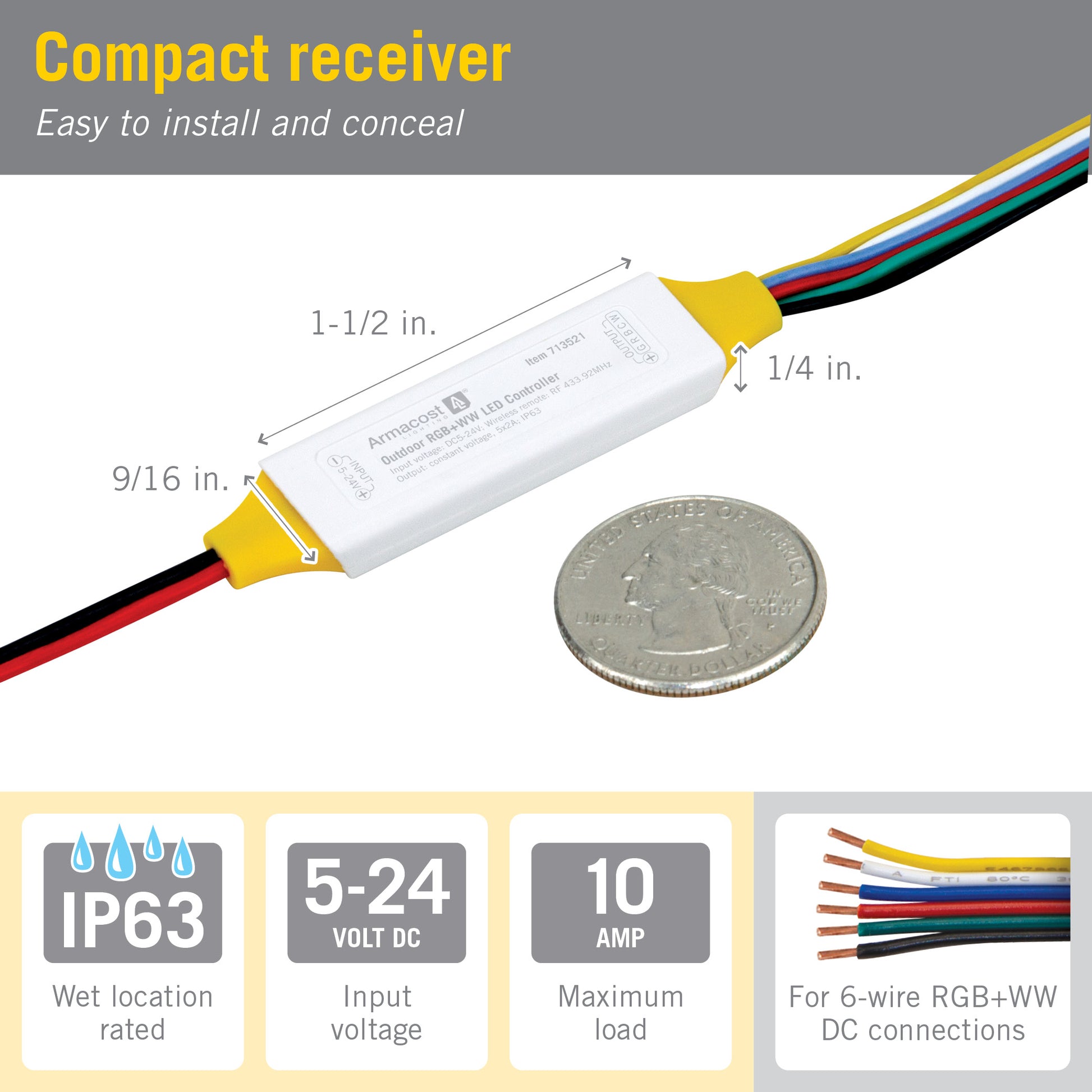 Enjoy full control of your multicolor waterproof LED lighting with the Armacost Lighting Outdoor RGB+WW LED Controller. Designed for reliability and performance, this IP63-rated waterproof receiver and hand-held remote controller combo makes it easy to customize your outdoor LED lighting with rich colors and beautiful white light, from warm (2700K) to cool (5000K). The compact remote is for indoor use (not waterproof) and features RF Radio Frequency technology that works through walls and doors, allowing you to adjust brightness, save favorite settings, and create the perfect lighting for patios, decks, pergolas, or docks.